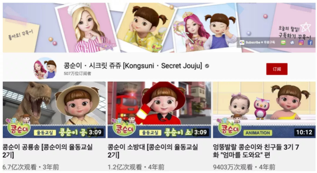如今,以Kongsuni和SecretJouju开设的Youtube账号的订阅人数已经达到了507万。其中Kongsuni的恐龙科普动画的播放量达到了6.7亿次,Jouju最高的播放量则是600万。而且,Jouju从2012年以来一共出品了13季的3D动画,还开创了新词“Fashion Idol”。