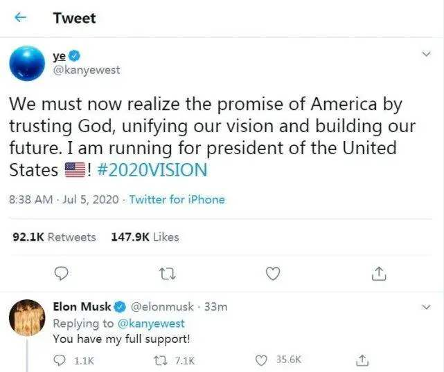 这番发言一出,凑热闹不嫌事大的特斯拉首席执行官埃隆·马斯克和侃爷媳妇金·卡戴珊立马跟上表示支持。截至7月7日凌晨,这帖已被转发52.7万次,获得10.8万留言以及117.8万点赞。