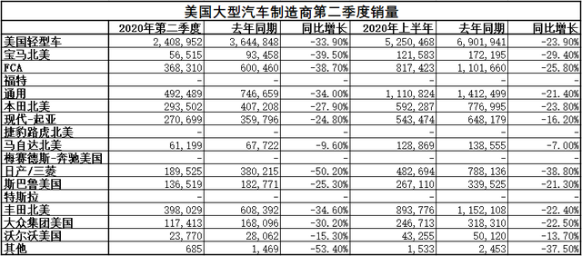 菲亚特·克莱斯克称,受疫情影响,其北美市场第二季度销量下滑39%,至367,086辆,各品牌的销量降幅均在21%以上。福特的销量跌幅小于另外两家美国车企。第二季度,探险者和Ranger的销量分别提升了12.4%和19.8%。福特表示,第二季度,其面向普通消费者的销量同比下降14.3%,其中卡车销量下降0.4%,SUV销量下降22%,轿车零售量暴跌34.7%。