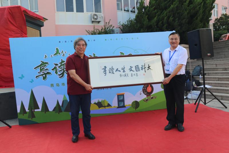 青岛市文旅局新闻出版与版权管理处副处长姜楠向青岛科技大学传媒学院执行院长杨建华赠送朗读亭钥匙,传递市文旅局、市广播电视台对青岛科技大学阅读活动的信任与期许。中国书法家协会会员、青岛市书法家协会副主席宋文京先生将书法作品《享读人生 文汇科大》赠送青科大,激励青科大师生参与到全民阅读中。