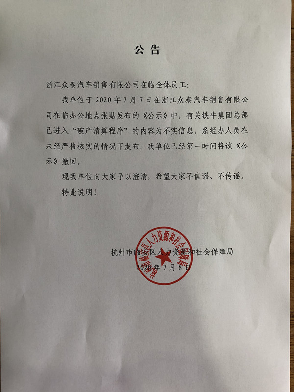 7月7日,一张落款为“杭州市临安区人力资源和社会保障局”的公告内容显示:“因铁牛集团总部已确认进入破产清算程序,众泰汽车集团总部已连续7个月未支付员工工资,为保障浙江众泰汽车销售有限公司在临员工的合法权益,现对截至2020年6月底员工工资结算清单进行公示,请员工认真核对,如有异议请在7月8日15日前到公司进行核对。”