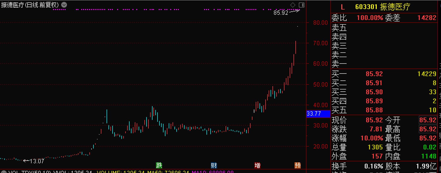 数据显示,今年以来,振德医疗的累计涨幅高达457.41%,尤其是6月以来,振德医疗更是不断攀高,7月9日股价更是上摸85.92元的历史新高。