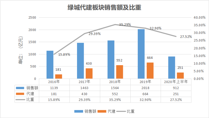 今年上半年,绿城代建实现销售额251亿元,占集团总合同销售金额约27.5%。在过去的几年中,母公司绿城中国(HK.03900)高层动荡不断,业绩增长乏力。期间,代建板块为粉饰公司销售额发挥了相当大的作用,其销售额一度接近集团总销售的四成。