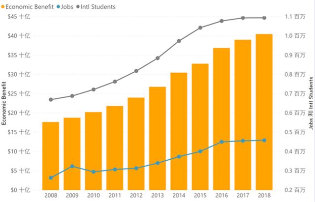 (2008—2018年留学生对美国经济贡献一览表 来源:美国国际教育工作者协会NAFSA)