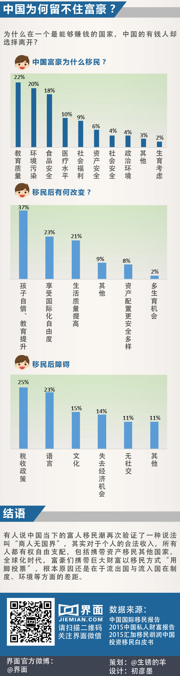 中国当下富豪移民的大潮再次验证了一种说法:“商人无国界”。教育质量、环境污染和食品安全仍然是促使移民的三大动因。