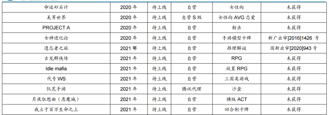 据华泰证券统计显示,三七互娱2020年储备的在研游戏包括《代号荣耀》、《末日沙城》、《代号 NB》、《代号 DL》等十余款。就品类而言,公司预计打造二次元、国风等风格,玩法上从 MMO拓展到 SLG、卡牌等。