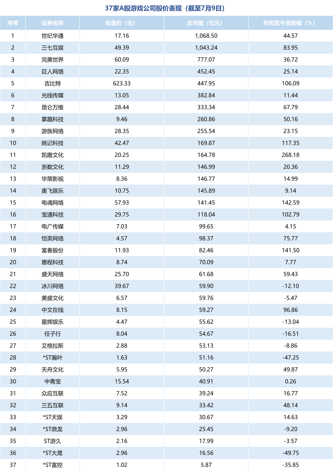 三、A股市值超百亿的游戏股已有13家,年初至今最高涨幅268%