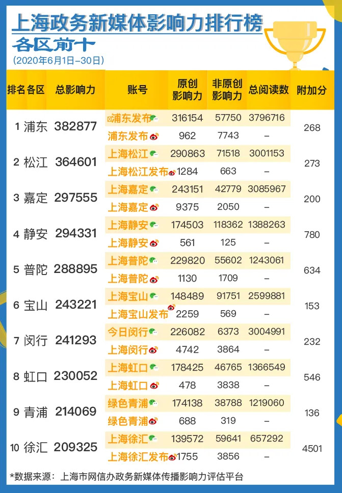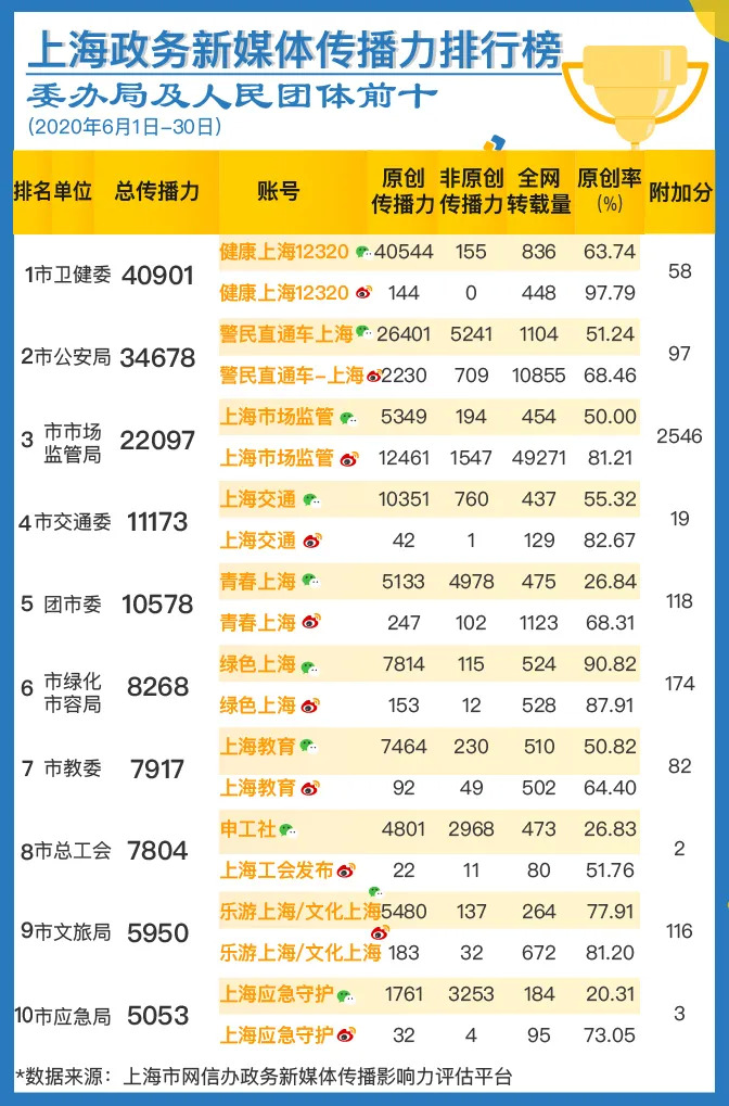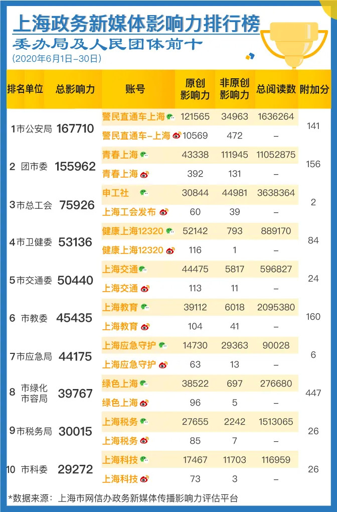 榜单由上海市委网信办与上海市政府新闻办公室联合发布。数据来源于上海市委网信办自主研发的“政务新媒体传播影响力评估平台”,目前该平台覆盖全网各渠道,纳入了276个新闻客户端、251家新闻网站、1200万微信公众号、3亿多微博账号的数据。