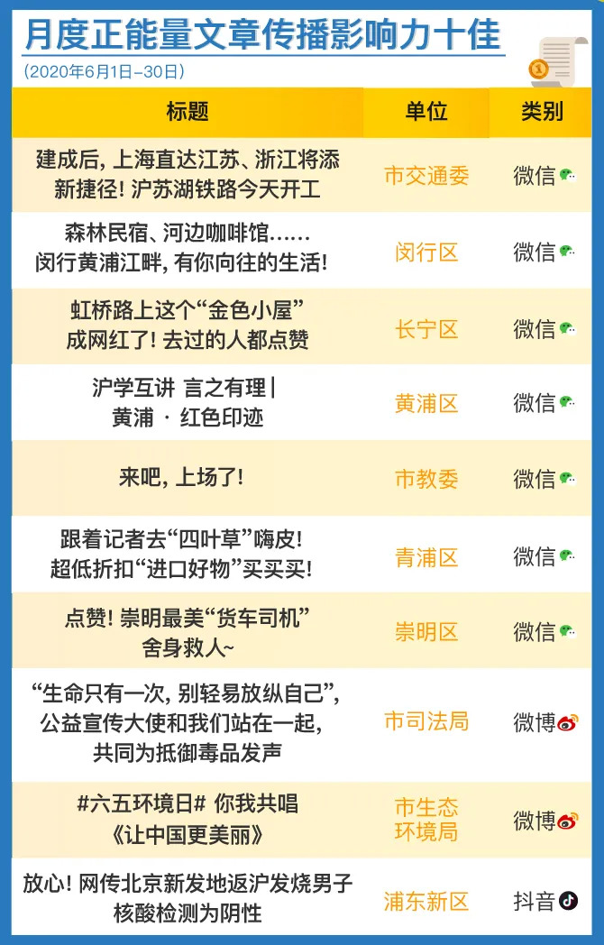 从本月正能量十佳稿件来看,各单位围绕主业,亮点纷呈。市交通委服务长三角一体化发展,推进基础设施建设;闵行区、长宁区、青浦区积极展现乡村振兴、助老服务成果和消费复苏氛围;黄浦区围绕“四史”学习教育,挖掘红色资源;市教委邀请上海高校领导,为特殊时期的毕业生加油鼓劲;市司法局、市生态环境局紧扣国际禁毒日、世界环境日,传递正能量;崇明区点赞凡人善举;浦东新区及时辟谣,遏制疫情谣言散播,取得积极效果。