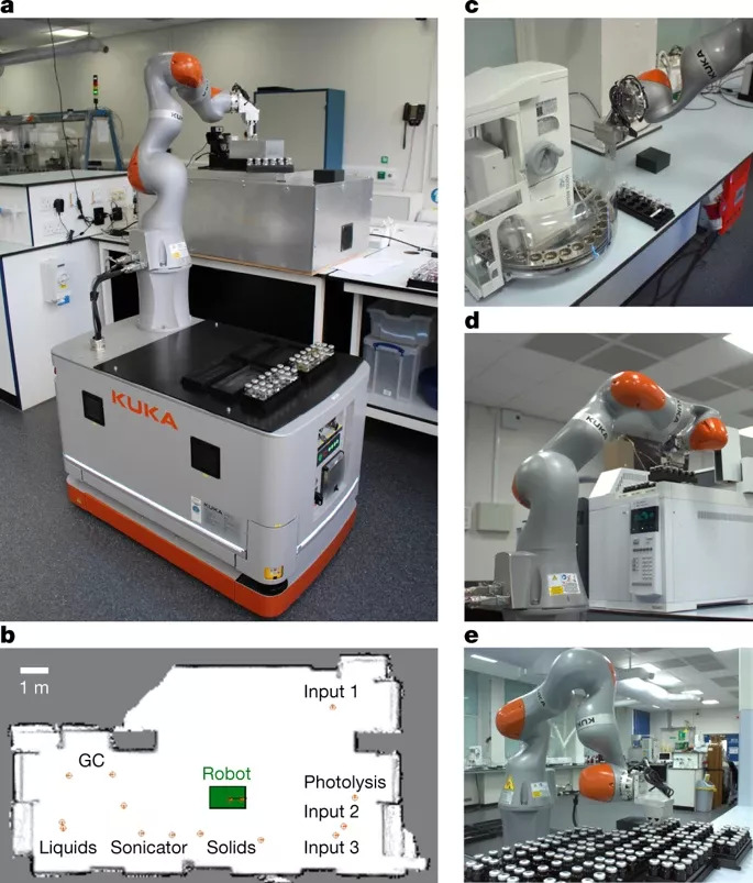 在化学实验室里,自动化技术正在兴起,但迄今为止我们所说的「自动化」还仅限于一些仪器和定制界面,让部分机械与设备协同工作。利物浦大学的 Andrew Cooper 等人最近使用汽车生产过程中流水线上的工业机器人在湿化学实验室中实现了和人类一样的工作能力。现在,机器人可以使用和人类一样的工具做实验了。