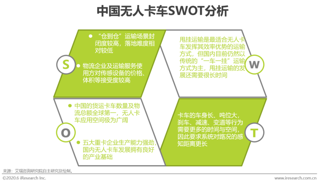 近年来,自动驾驶技术的开发与应用一直深受各界关注,与无人卡车相比,无人驾驶乘用车往往更吸引普通民众的眼球。从技术角度出发,应用在无人卡车上的自动驾驶技术与乘用车并无二致,其系统架构同样是由感知层、决策层与执行层组成,感知载体也都以摄像头、激光雷达、毫米波雷达、超声波雷达等传感器为主。但对于目前尚处在实验阶段的无人驾驶车辆而言,城市路况的复杂程度和不确定因素给无人驾驶乘用车的商业化道路带来极大的障碍。反观物流领域,港口、物流园区、高速公路等道路运输主要场景的封闭性较高,运输路线相对较为固定,测试数据的获取与积累也更容易。从商业化的进程来看,以图森未来为代表的L4级别自动驾驶卡车已经率先进入到了试运营阶段,无人卡车的商业化序幕正在缓缓拉开。但这只是无人卡车在物流运输中的初步尝试,目前仍然存在技术稳定性有待验证、可测试路段较少、国内甩挂运输份额较小等诸多问题还未解决,无人卡车距离大规模商业化应用尚需时日。