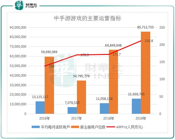 中手游的成长性对字节跳动来说也是非常具有吸引力的。2016年-2019年,中手游平均每月活跃用户由1311.5万增至1593.07万,新注册用户总数由5969.1万增至8571.27万,ARRP(每名付费用户每月平均收益)则保持了快速的增长,由138元人民币(单位:下同)增长52.75%至210.8元。