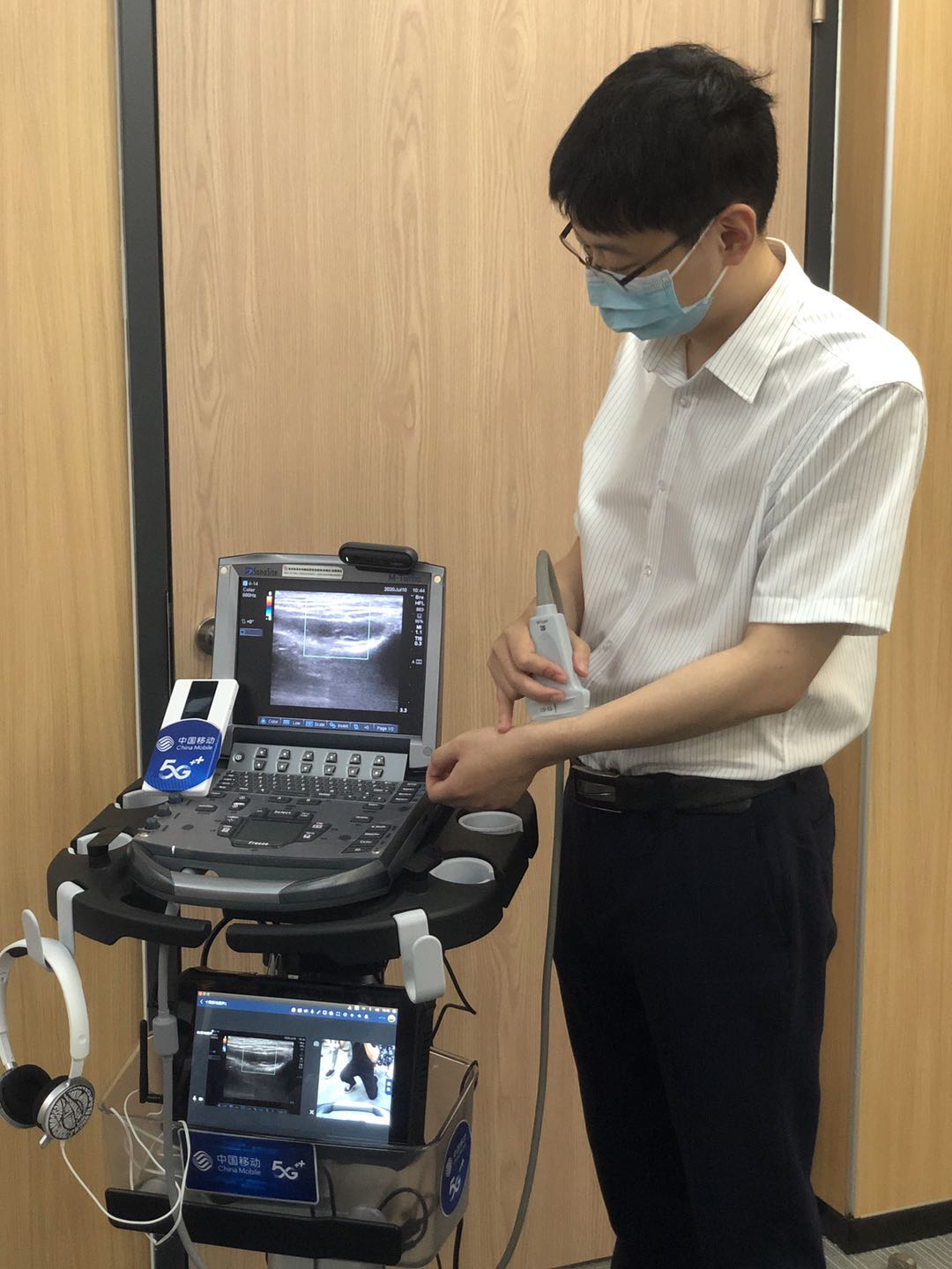 目前,5G网络已覆盖医十院胸痛中心、三楼超声科等相关区域,5G+床旁移动超声抵近临床一线,可避免患者搬动,降低人群聚集,已于院内胸痛中心、妇产科、骨科等多个专业科室投入使用,也在抗疫关键时期里发挥重要作用。
