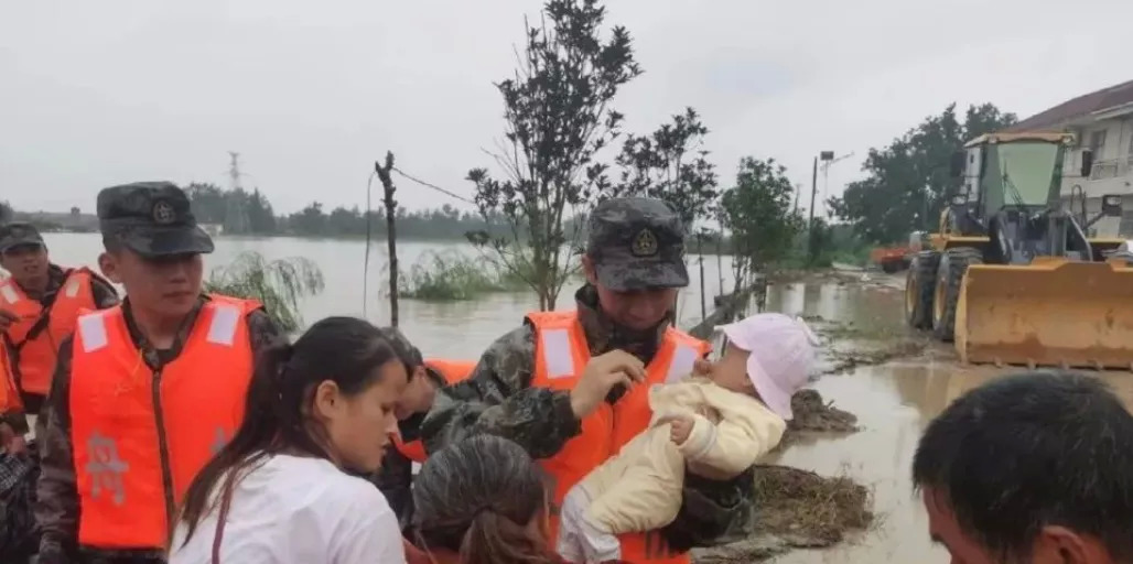 8日17时28分,空降兵部队迅速集结应急队伍,紧急出动官兵1000多人,携带冲锋舟、救生衣、土木工具等抗洪抢险物资器材,采取摩托化运输方式跨区机动240公里,驰援湖北省黄冈市黄梅县。