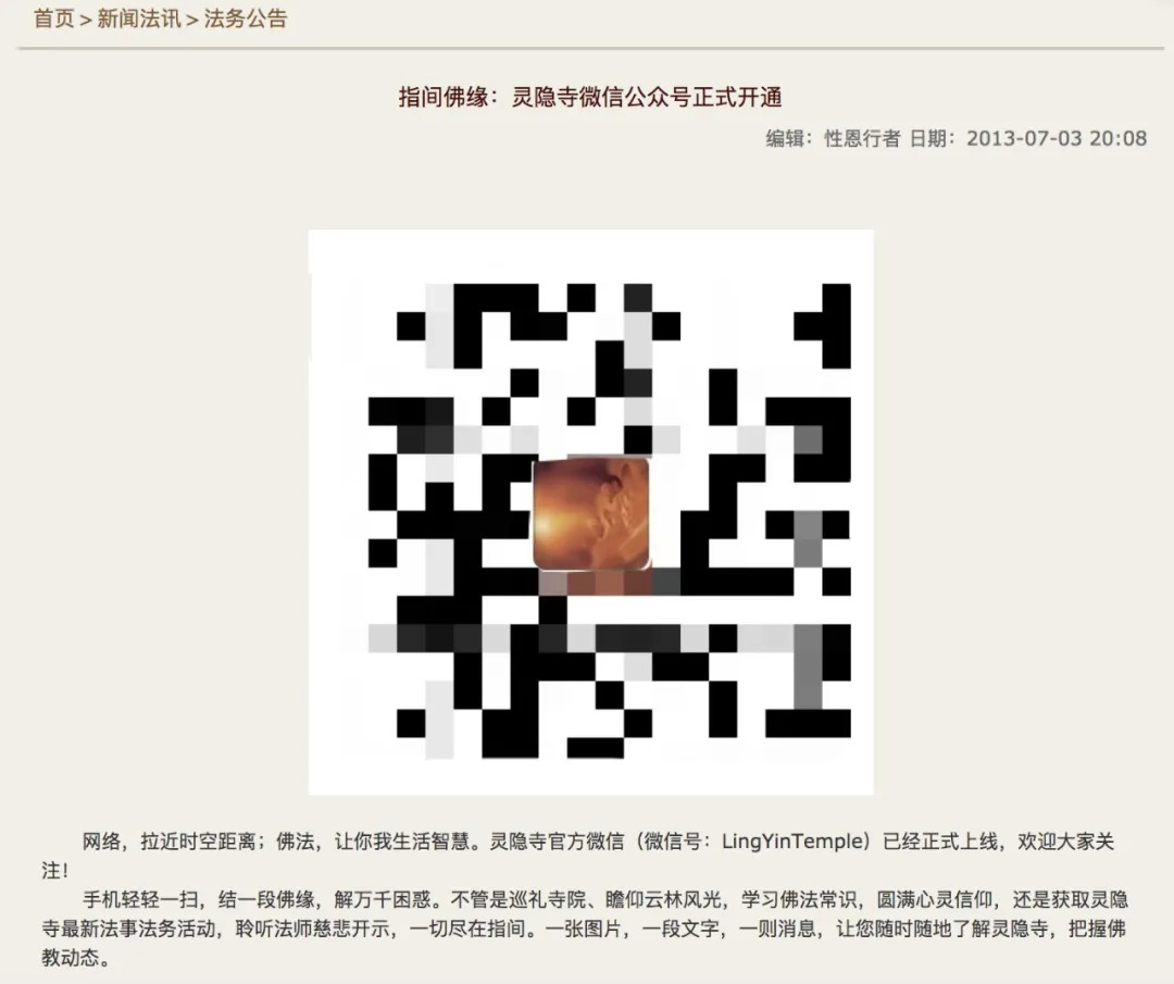 2013年7月,拥有一千七百年的历史杭州名刹灵隐寺注册了微信公众号,从此维持日更,如今保持每天发布4条内容。