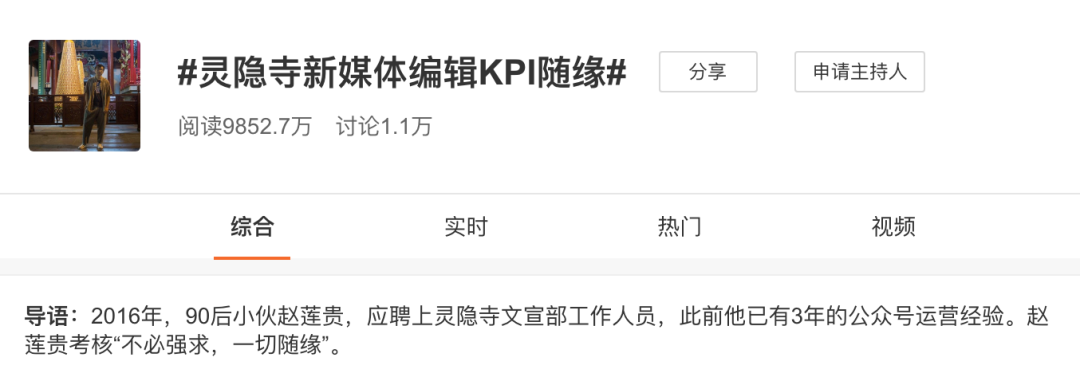或许是“灵隐寺”与“新媒体”二词一古一今的奇妙碰撞效果,或许是快时代下后浪们的焦虑使然,赵莲贵一句 “kpi随缘”引发9852万阅读。人们对他一年多的寺中职业生涯充满了好奇:什么样的人能被录用?无kpi的薪酬待遇怎样?是否与世隔绝、青灯古佛?为何最终选择了离职?