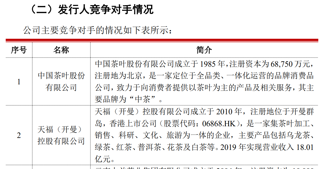 在这方面,普洱澜沧的描述也类似,其还借用中国茶叶流通协会数据及公开资料整理透露,云南省拥有茶叶精制企业超1000家,2018年云南省规模以上(年产值1000万元)茶叶企业为180余家,茶叶企业数量众多,产业集中度相对不明显。值得注意的是,虽然中国茶叶的竞争对手中,没有普洱澜沧的名号,但普洱澜沧却把中国茶叶放到了主要竞争对手的首位。