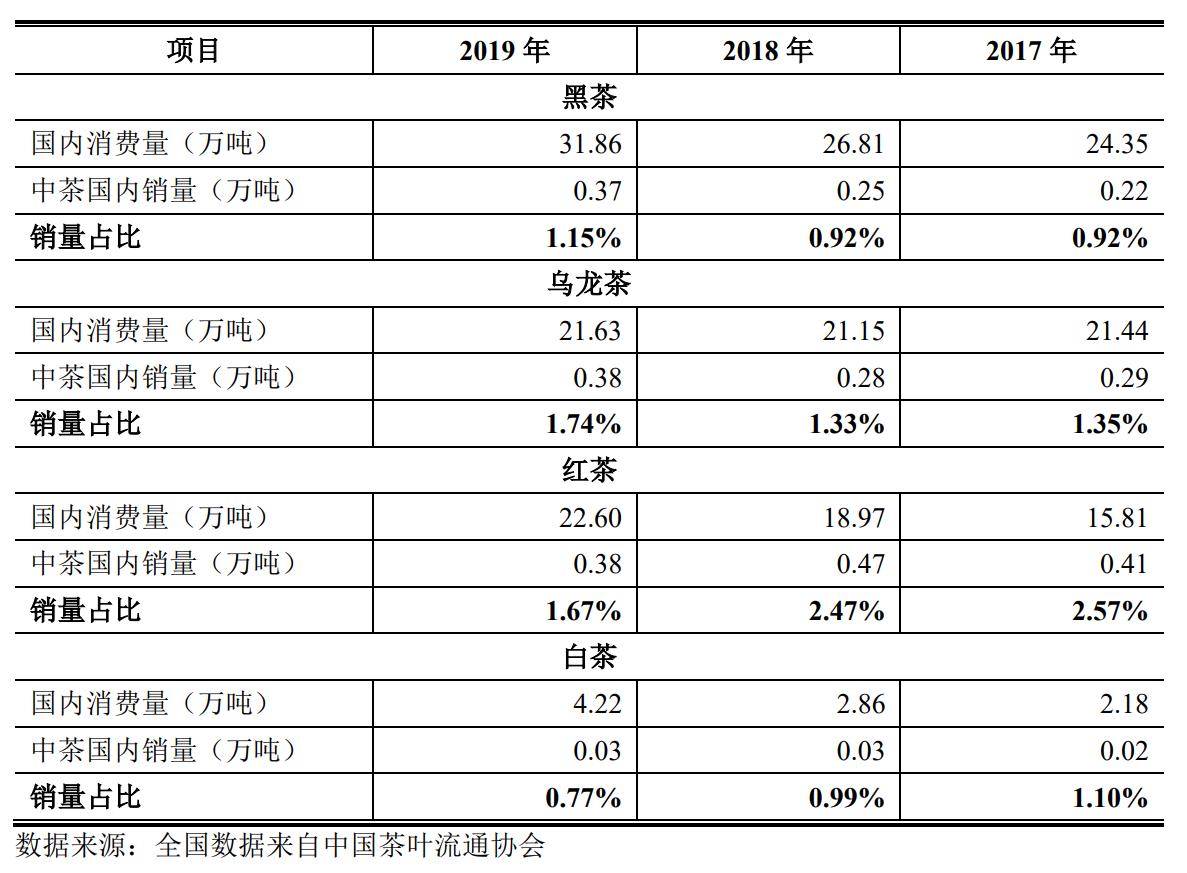 中国茶叶说明书中数据显示,2017年我国茶叶企业总数约为6万余家,其中规模企业为1600余家,仅87家企业总资产超过1个亿,6家企业总资产超过10亿,整体呈现集中度偏低的情况。即使是中国茶叶,其黑茶2019年国内销量0.37万吨,市场占有率仅为1.15%,2018年、2017年还更低;乌龙茶市占率1.74%;红茶市占率1.67%;白茶市占率0.77%。在中国茶叶眼里,普洱茶业务主要竞争对手为云南大益茶业集团有限公司。