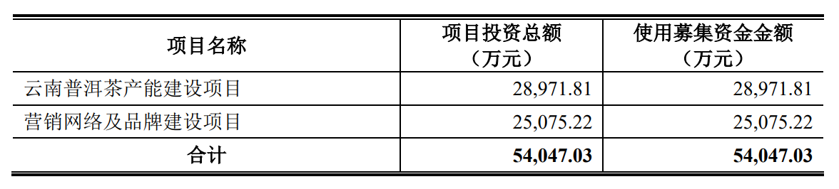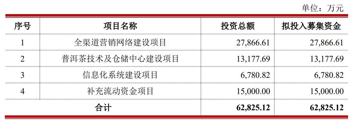 此番普洱澜沧此番募资逾6亿元,投入“全渠道营销网络建设项目”、“普洱茶技术及仓储中心建设项目”、“信息化系统建设项目”、“补充流动资金项目”。