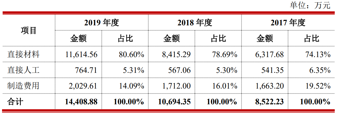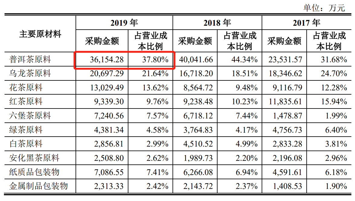 从每公斤采购价格来看,中国茶叶和普洱澜沧是差不多的。但最值得注意的是,普洱澜沧称,报告期各期普洱茶产品的平均销售价格分别为每公斤378.61元、500.82元和579.94元,呈现的是持续增长的态势。2019年的售价甚至比中国茶叶的两倍还多。也因此,毛利率方面普洱澜沧就显得占优,2017年至2019年普洱澜沧的毛利率分别为65.69%、64%、61.89%。另外,从主营业务成本构成来看,普洱澜沧2019年直接材料成本占80.6%。