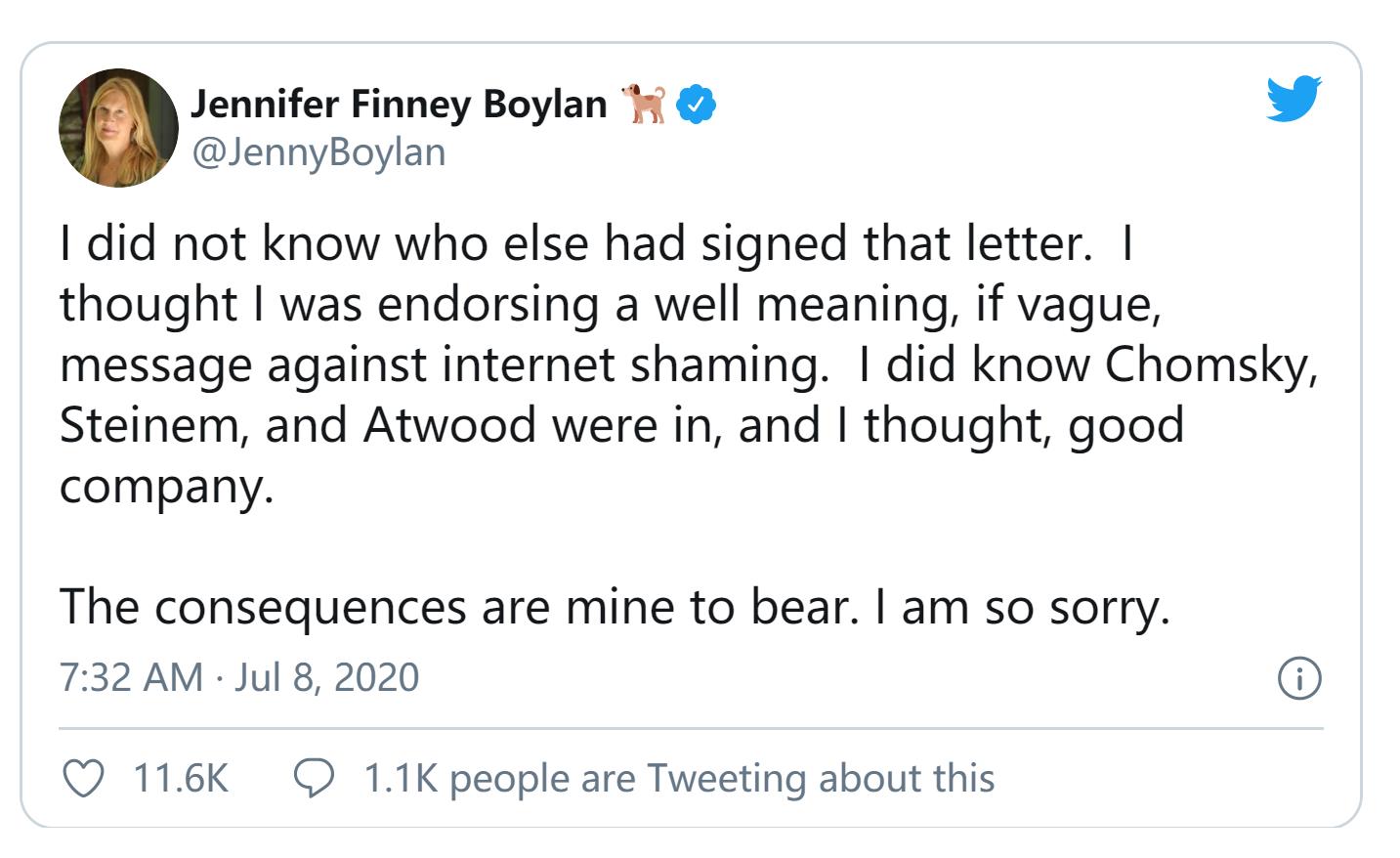 或许正因如此,在公开信发表当日,至少有两名签名者公开表示与该信件保持距离。作家詹妮弗·芬尼·博伊兰(Jennifer Finney Boylan)在Twitter上表示:“不知道还有谁在这封信上签了名。我认为我是在支持一个尽管言辞模糊,但善意的、反对网络羞辱的信息。我愿意承担这封信导致的后果,对此我感到很抱歉。”另一位签名者,历史学家Kerri Greenidge则直接声明她不支持这封信,并要求《哈泼斯杂志》撤回签名。
