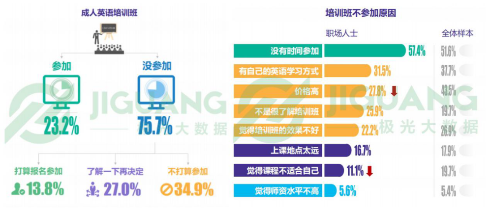 其中超过3/4的人没有参加过培训班。职场人士参加培训班的最重要原因,是希望快速提高英语水平。因为职场人士工作时间占据日常生活的绝大部分,学习时间有限、时间成本高。因此这个群体通常更注重效率,支付学费有很强的目的性。而不愿意参加培训班的主因是没有时间;其次是有自己的英语学习方式;再次是价格高。
