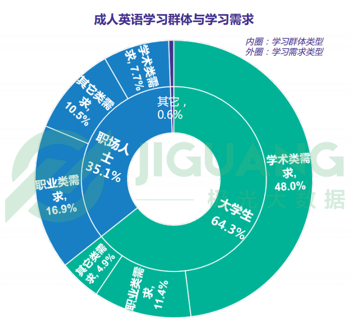 极光大数据发布的《2018年成人英语学习群体研究报告》(以下简称《报告》)中显示,在成人英语学习群体中,大学生占比近2/3,职场人士占比约1/3。学习需求方面,大学生主要以学术类需求为主,兼有部分求职面试等职业类需求;而职场人士以职业类需求为主,兼有国外旅游/居住等其他需求。