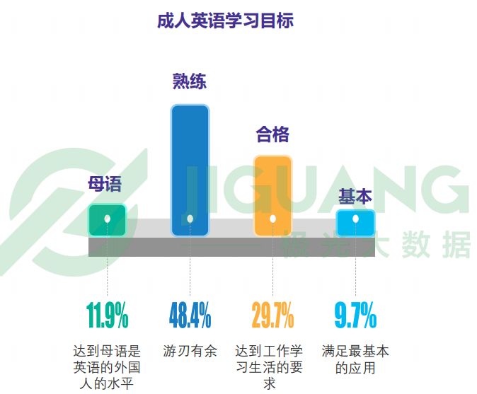 《报告》显示,成人英语学习群体期望达到的水平比较高,超六成用户希望达到熟练(游刃有余)或母语的水平。