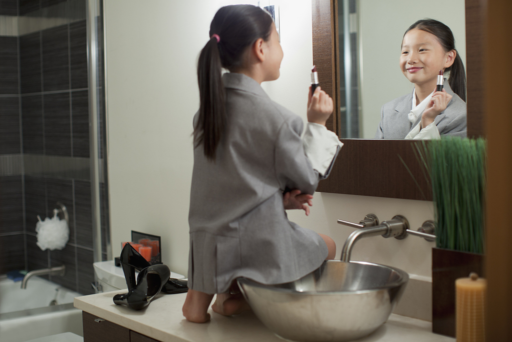 江臻的女儿是个臭美狂热份子,从1岁开始就爱捣鼓她的化妆包,自顾自地涂涂抹抹。江臻对此并不反感,她最担心还是安全问题。
