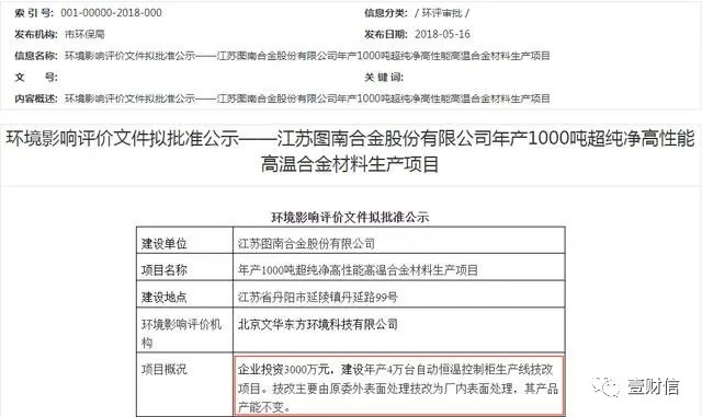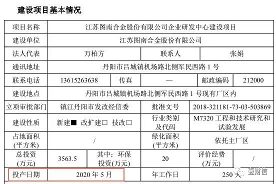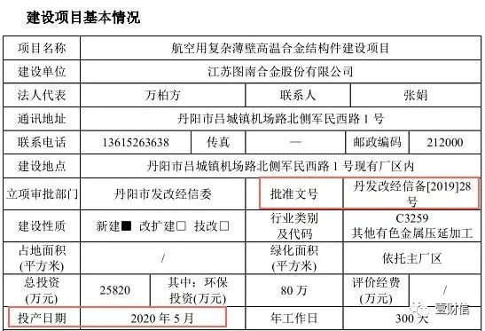 根据招股书,高温合金结构件项目的建设周期为30个月。此项目于2019年4月10日获得丹阳市环境保护局出具的批文(丹环审[2019]39号)。但是2019年3月20日,丹阳市环保局公示的受理的此项目环境影响报告表披露,高温合金结构件项目投产日期是2020年5月,从项目审批同意到投产,仅仅13个月的时间。招股书披露的建设周期延长了1.3倍。