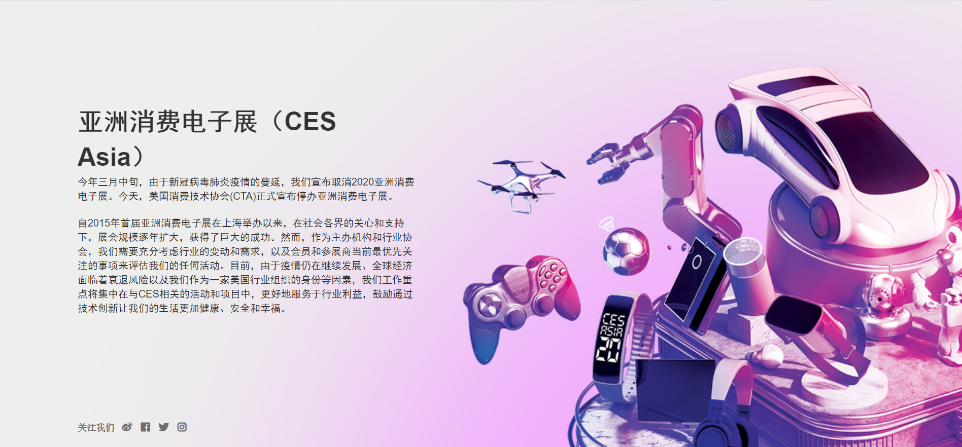 今年三月,由于新冠病毒肺炎疫情,主办方宣布取消2020亚洲消费电子展。如今,美国消费技术协会(CTA)正式宣布停办亚洲消费电子展。