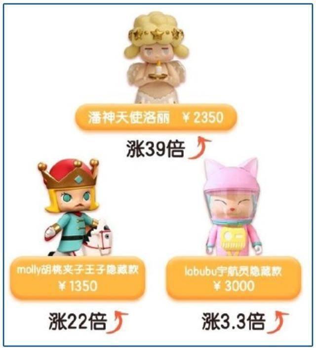 据了解,泡泡玛特的潘神圣诞“隐藏款”,原价59元,闲鱼价2350元,狂涨39倍,Molly胡桃夹子王子“隐藏款”,原价59元,咸鱼价1350元,涨幅为22倍。