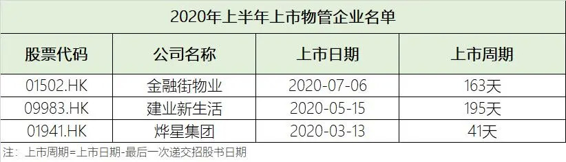2020上半年,共有3家物业管理企业在港股上市,分别为金融街物业、建业新生活及烨星集团。以最后一次递交招股书至上市日计算,上市周期最短的物管公司当属烨星集团,上市仅用时41天,而金融街物业则耗时163天才撬开港交所的大门。