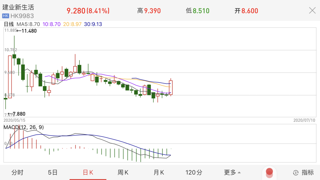 而另一只物业股建业新生活在开盘前三日一路大涨,随后开始走“下坡路”。自6月起,建业新生活的股价在波动中呈下滑趋势。截至7月10日,该公司的股价涨超10%。