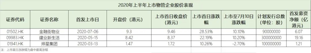 从上市首日的股价表现情况来看,上述三家公司(金融街物业、建业新生活及烨星集团)在上市首日均实现“开门红”。其中,金融街物业的首日涨幅最为明显,最高涨幅达28.53%。从长期来看,截至7月10日收盘金融街物业的股价涨幅超10%。