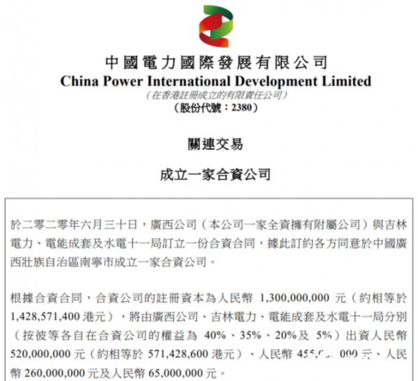 中国电力成立合资公司,出资5.2亿成为大股东,并不是全部以现金的方式注资,其中还包含以其持有灵川风电、灵山风电及金紫山风电的权益作为其出资,这样也会相对减轻其资金压力。
