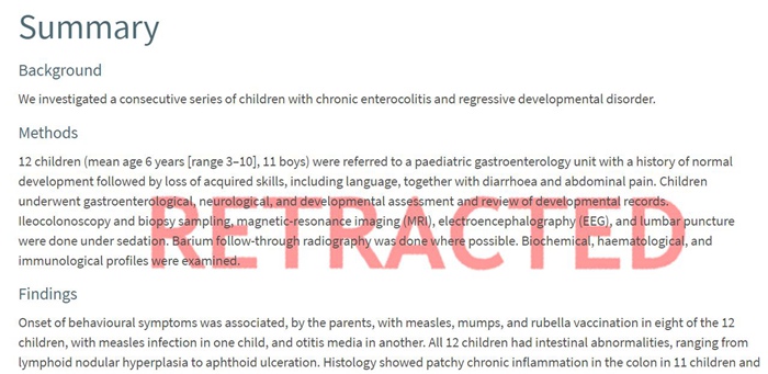 该报告对12名有行为障碍和肠道问题的儿童进行研究,发现其中八人曾注射过麻疹、腮腺炎和风疹疫苗。报告称,研究显示正是麻疹、腮腺炎和风疹疫苗造成了相关儿童的自闭症。