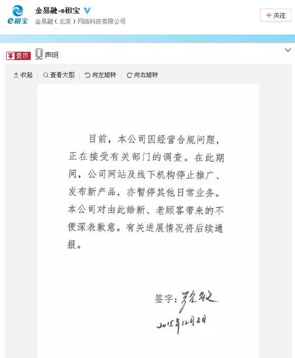 e租宝通过官方微博宣布全面暂停日常业务。
