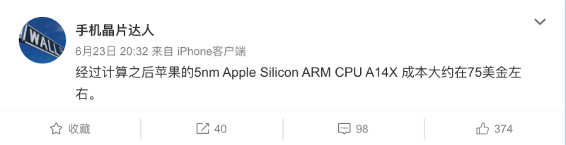 6月23日WWDC 20大会结束后,@手机晶片达人又发布微博,称其预计5nm Apple Sillicon ARM CPU A14X成本约为75美金左右。相比之下,基于X86架构的10nm 4核酷睿i7处理器售价在300~400美元左右。