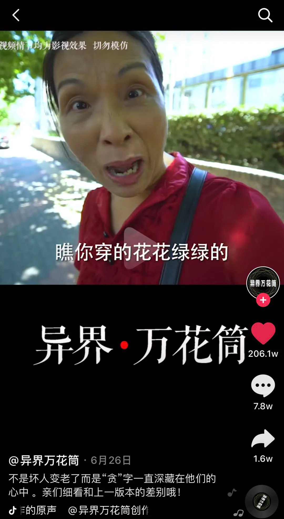 相比平平无奇的网剧和网大,短视频倒是蹭恐怖元素的高级玩家。抖音号异界万花筒,把占便宜大妈、熊孩子、绿茶女、妈宝男给“妖魔化”了。镜头把他们令人嫌厌的点放大,又设定一个不断变化的贪心值、绿茶值、熊力值。达成百分百后,这些讨厌的角色就会被神秘力量惩罚。