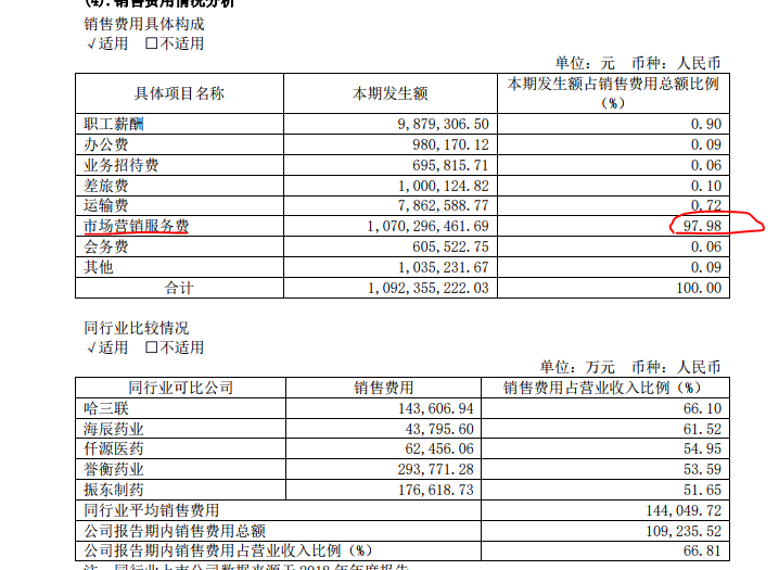 2019年,灵康药业的销售费用达到10.92亿元,占营业收入比例为66.81%,高于同行业平均水平。其中市场营销服务费10.7亿元,占比97.98%。公司的市场营销服务费则由市场推广费3.87亿元、市场调研费3.52亿元、市场营销策划费为2.46亿元、咨询服务费0.85亿元等组成。