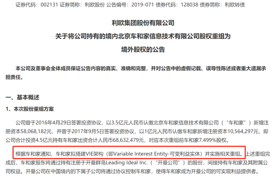 根据车和家股东之一利欧股份2019年6月的公告,车和家在去年就开始拟搭建VIE架构,并提到“标的企业计划赴境外融资,正在搭建红筹架构,需要对公司架构进行重组”。