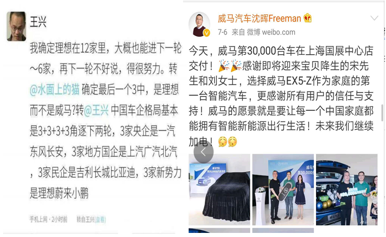 王兴在饭否上发表了“3+3+3+3”的预测,认为新势力中“蔚小理”会是胜出的三家。威马汽车CEO沈晖不服——毕竟到今年7月6日,被“蔚小理”看不起的威马已经交付了第3万辆车。