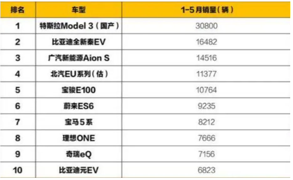 2020年1-5月新能源汽车销量排行榜,特斯拉国产Model 3依旧“霸榜“,销量是新势力老大蔚所有车型同期累计销量的近3倍,理想ONE的4倍多。