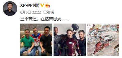 今年6月6日,小鹏汽车CEO何小鹏发微博称“三个苦逼,在忆苦思变……”,并附他和李想、蔚来汽车CEO李斌的合照。