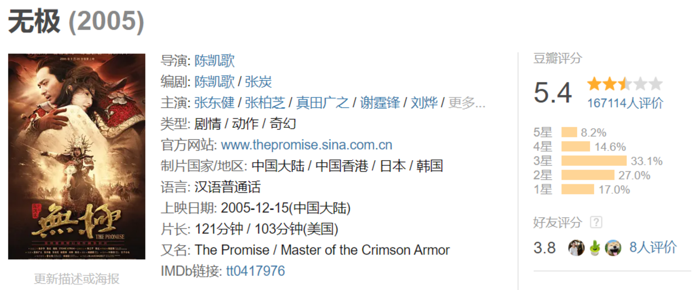 今天,《无极》在豆瓣上的评分停在了5.4分的水平,是名副其实的烂片。