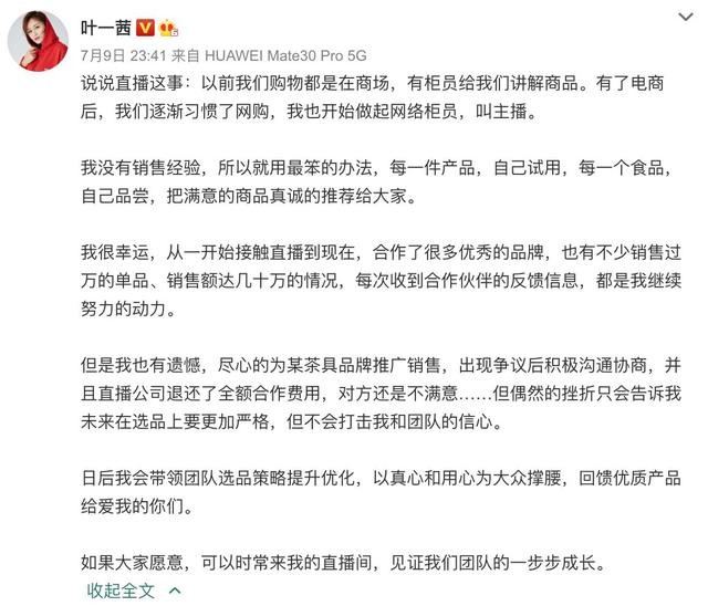 “90万人观看成交不到2000元”的叶一茜,跟吴晓波有着相似的遭遇。虽然叶一茜在第一时间做出了回应,表示已退还品牌全部费用,但商家似乎并不满意。