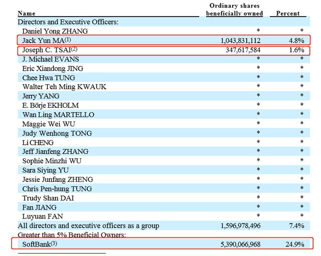 阿里巴巴集团向SEC(美国证券交易委员会)提交财年报告,报告中显示,截至2020年7月2日,马云持股比例下降至4.8%,蔡崇信持股比例下降至1.6%,软银持股比例下降至24.9%,但软银仍为阿里巴巴集团持股比例最高股东。