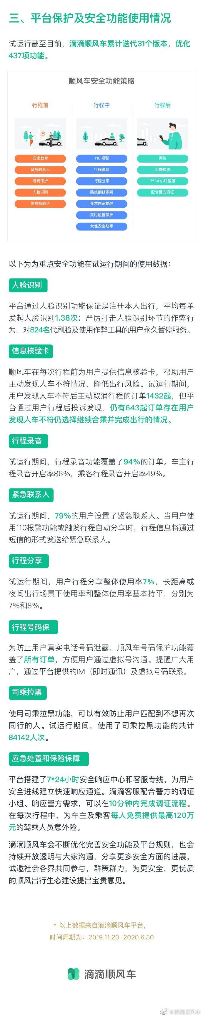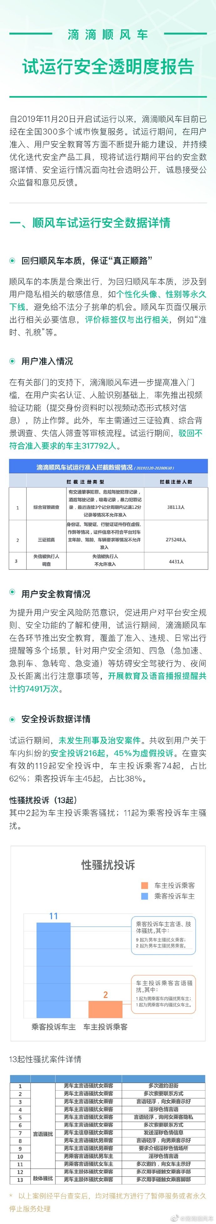 7月13日,滴滴顺风车首次披露安全数据。去年11月恢复试运行以来,平台驳回了不符合准入的司机32万人,同时发现643位用户发现人车不符仍继续出行、部分安全功能使用率偏低等情况,提醒用户提升安全意识。