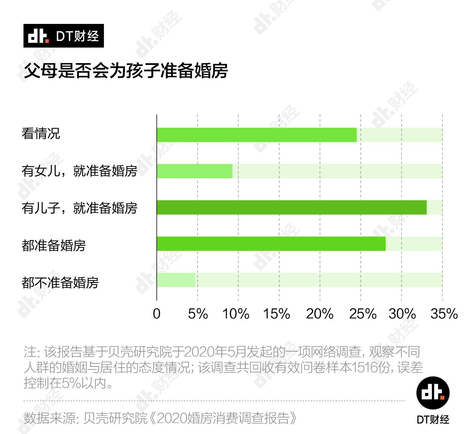 这样看下来,如今婚房市场上的购房者,总体比较理性,对于购房出资以及后续的产权归属都有比较合理的认知和理解。但在性别差异上,认为男方应该更多承担婚房压力的呼声要更高,而且这似乎已经达成了一种社会共识。调查中的另一个问题也证明了这个观点——父母是否应该为孩子准备婚房?在给出肯定答案的受访者中,认为男方父母应该准备婚房的人是女方应准备婚房的3倍。